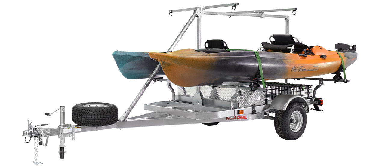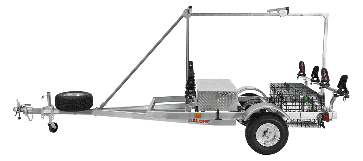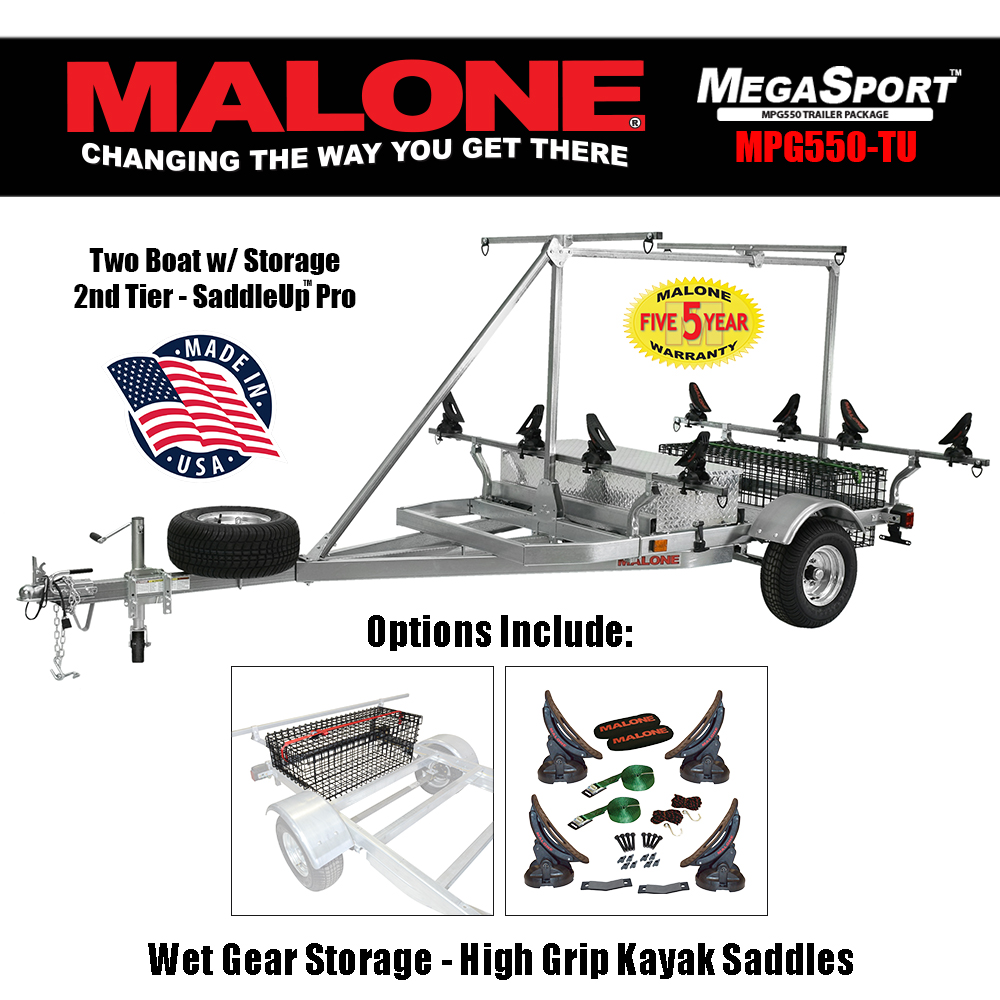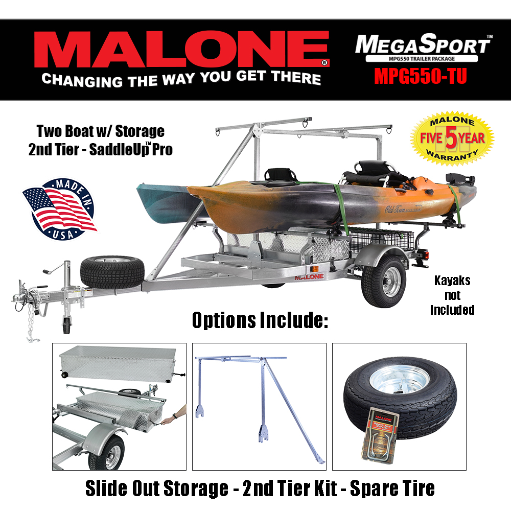 The MPG550-TU MegaSport™ trailer package is bundled with SaddleUp™ carriers, spare tire kit, aluminum diamond plate sliding storage drawer, 2nd tier load bars, and a wet gear basket.