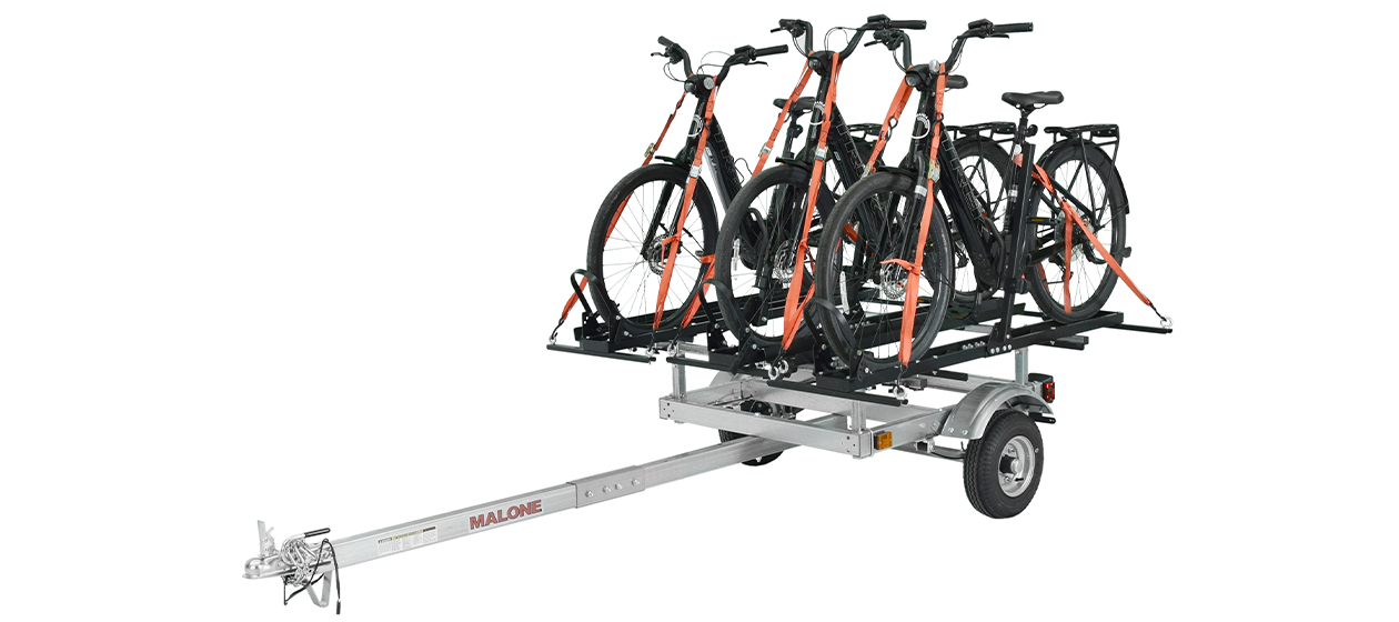 The Malone EcoLight™ trailer serves as the base for this package. Also included are three heavy-duty E-bike racks, each capable of transporting a bicycle, fat bike or E-bike up to 80 lbs. each. A lockable padded arm, front wheel cradle, and four tie-down cam-buckle straps hold the bike firmly in position. The EcoLight™ trailer features a “plug-&-play” LED submersible lighting system, 58" galvanized steel load bars and leaf spring suspension. The EcoLight™ trailer and E-bike racks are backed by a Five-Year Limited Warranty.
