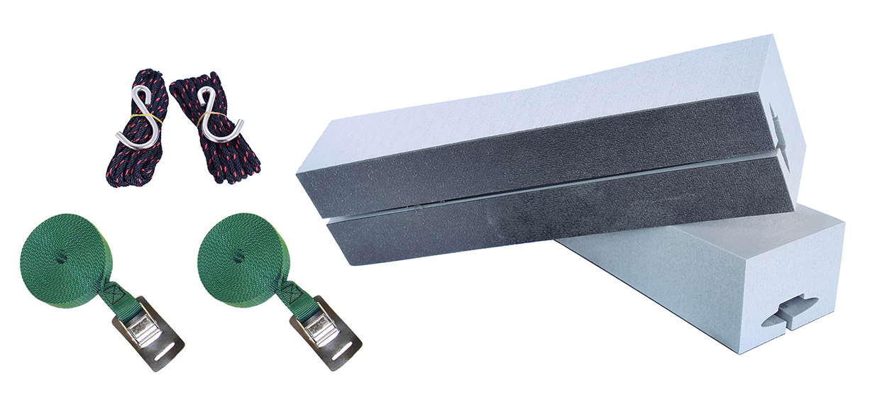 Standard Kayak Kit includes everything needed to safely and affordably transport one kayak. The 14" blocks feature a universal cut-out profile that fits round, square and oval load bars. Includes two 15' load straps and safety tie-downs. Made with the finest EVA closed cell foam.