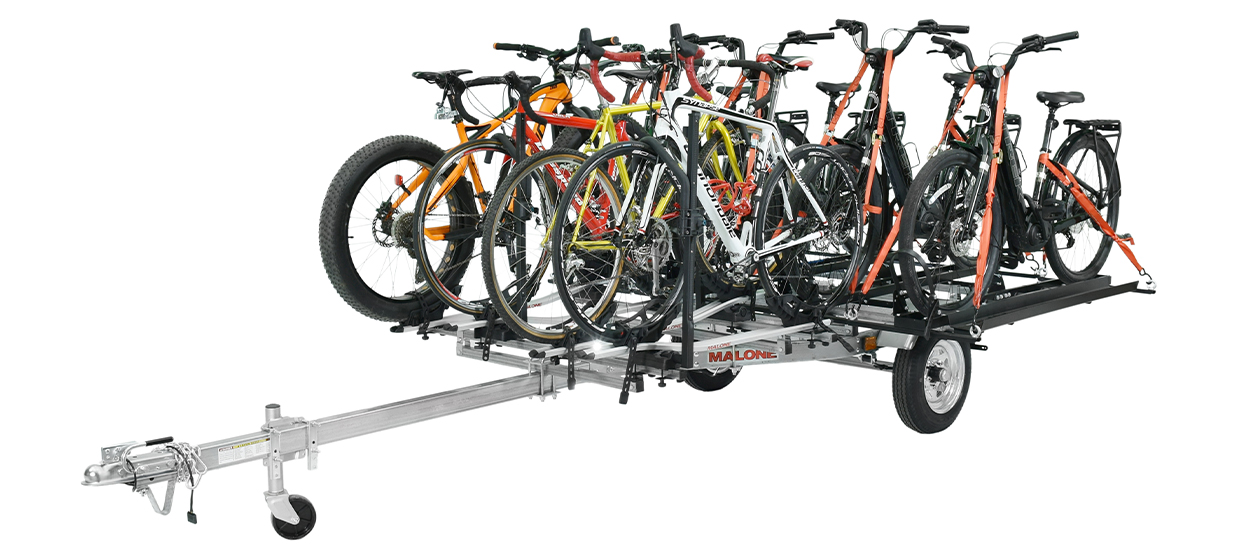 The Malone MicroSport™ LowBed™ Trailer serves as the base for this package. Also included are four heavy-duty E-bike racks, each capable of transporting a bicycle, fat bike or E-bike up to 100 lbs. each, and four tray style bike racks, each capable of transporting a bicycle or fat bike up to 33 lbs. each. The MicroSport™ LowBed™ trailer features a “plug-&-play” LED submersible lighting system, 78" steel load bars, and large 12” wheels. The MicroSport™ LowBed™ trailer is backed by a Five-Year Limited Warranty.
