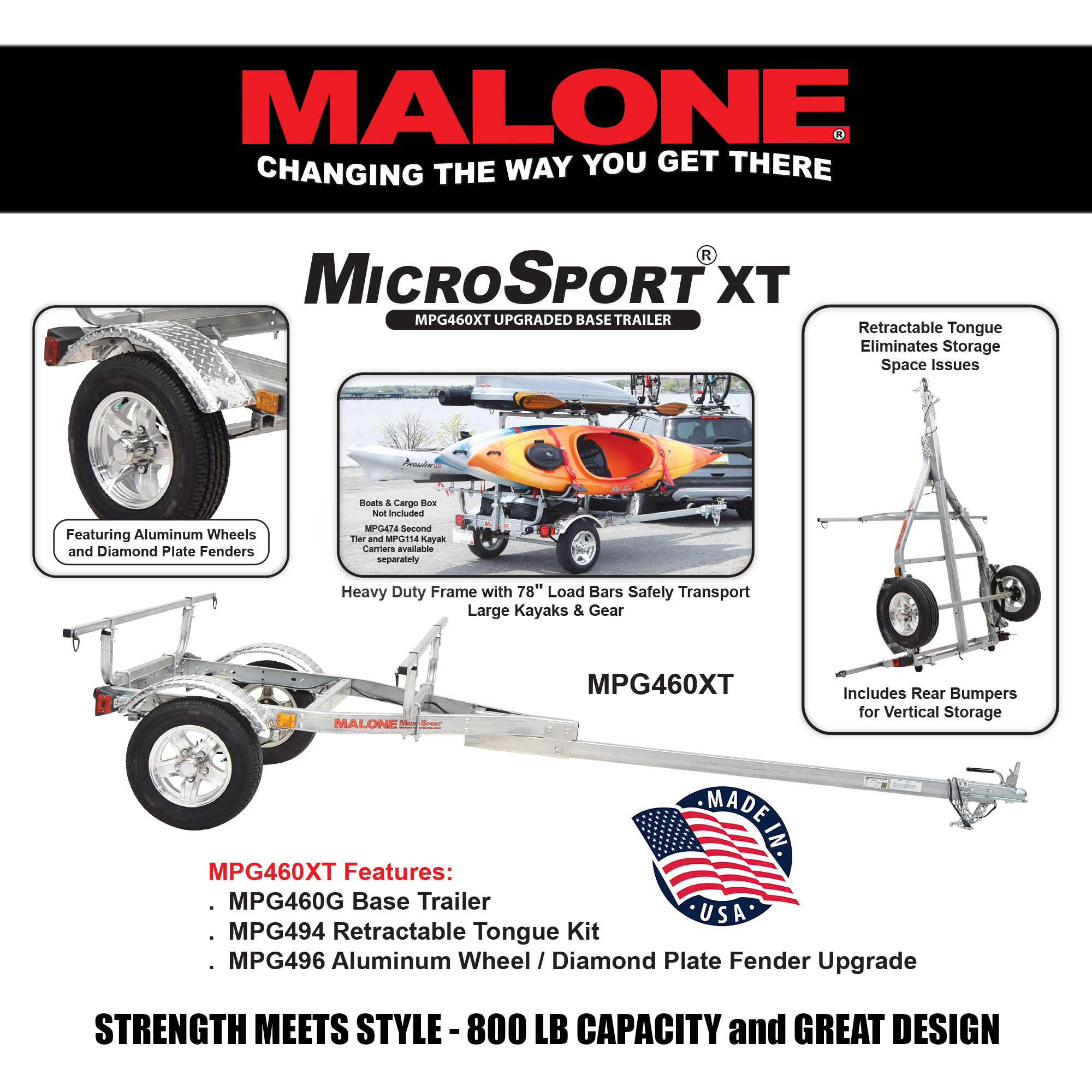 The MicroSport™ XT is an upgraded MicroSport™ trailer. The upgrades include aluminum spoke wheels, diamond plate aluminum fenders and a retractable tongue kit. The retractable tongue kit is great for garage storage and allows the trailer to be stored vertically with the rear bumpers included in the kit.