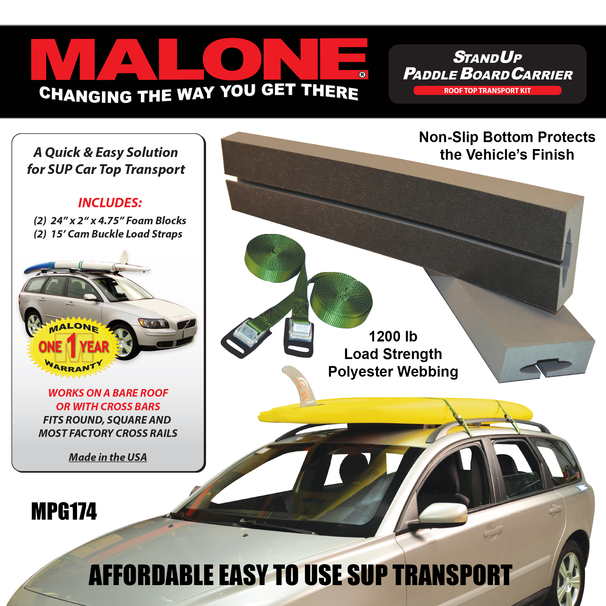 The Standard SUP Kit includes everything needed to safely and affordably transport one SUP. The 24" blocks feature a non-skid bottom and universal cut-out profile that fits round, square and oval load bars. Includes two 15' load straps and safety tie-downs. Made with the finest EVA closed cell foam.